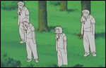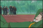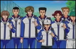 So anyway, let's go to the Ginka corner. They are the team which Ryoma wiped out because of the tennis ball on a previous episode. They're talking about their plan to defeat Seigaku, their next opponent. It was then that they spotted Seigaku walking towards them that they hid behind the trees.  One by one, as the Seigaku members walked by, Ginka made an assessment to each of the members. They've started with Tezuka, the Golden Pair, Kawamura, Kaidoh, Momoshiro then to Fuji. Ginka thought that they could not win any matches against Seigaku but when they thought about the rumour of a freshman regular of Seigaku, they seemed excited at the thought that they'll have someone to beat. It was then that Ryoma walked by and saw them. Ryoma asked them if they're there to collect their balls from him, and told them that he wouldn't be giving them back.