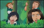 So anyway, let's go to the Ginka corner. They are the team which Ryoma wiped out because of the tennis ball on a previous episode. They're talking about their plan to defeat Seigaku, their next opponent. It was then that they spotted Seigaku walking towards them that they hid behind the trees.
