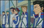 As the two get themselves ready for their match, the remaining regulars watched on outside the fence and take a vote on who they think would win. Only Momoshiro (and Kaidoh even though he didn't actually say it) think Ryoma could. Momoshiro reasoned out that he really wanted to see how far Ryoma could get with Fuji as an opponent.