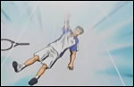 It was Ryoma's service game, he hit a normal serve then ran towards the net! It was serve and volley to the horror of Kawamura who warned him beforehand. Akutsu managed to hit the ball, but Ryoma hit a drop shot. Amazingly, Akutsu caught up to the ball and managed to hit it, it was a wrong move for him though, since Ryoma hit him with a Drive A, smack on Akutsu's face!
