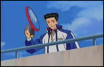 Due to his affronting attitude towards the Seigaku captain, Arai bursted a vein and hit a ball towards Kirihara shouting that he shouldn't be disrespectful to their captain, Kirihara lightly fielded the ball with his racket to the amazement of everyone. So anyway, before Kirihara left, he hit the ball towards Arai while his back was turned to him. This boastful attitude from him only led to missing Arai and hitting Momoshiro on the face, then the thrown racket from Momoshiro hitting Kachiro (who was carrying the balls) on the neck who looses his balance and spilled the ball on the court that led to the members of the club loose their balance and a lone racket from a random player who lost his balance, hit Kaidoh, who was sipping coffee, on the head. This prodded the temperamental player angry and this drove Kirihara to retreat from the vicinity immediately~ XD
